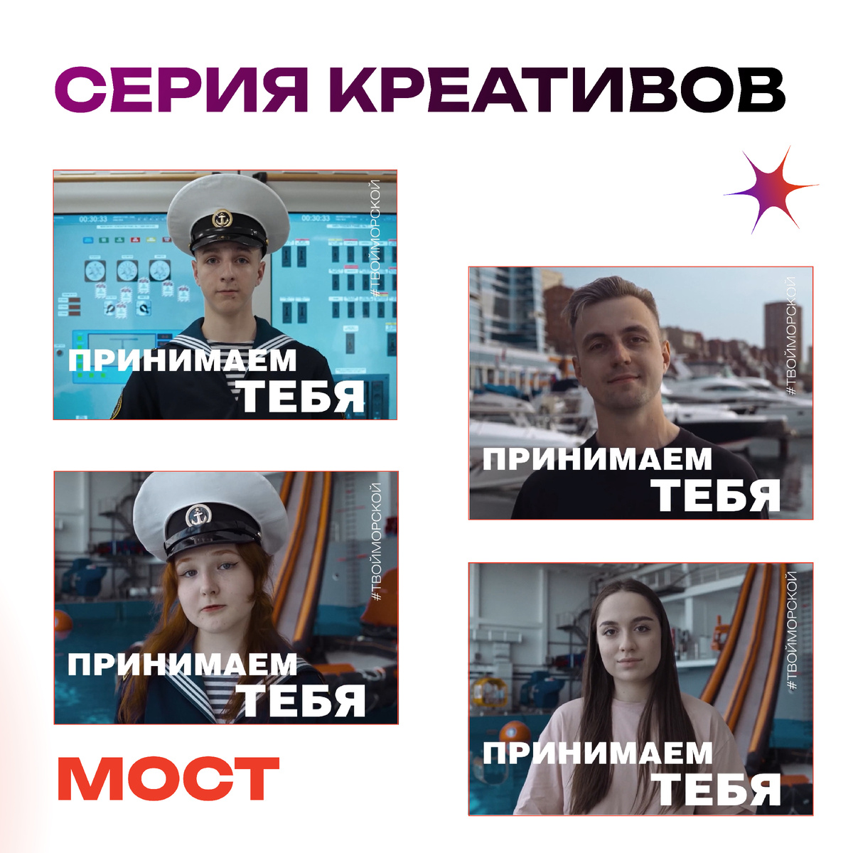 Мы разработали серию визуалов под слоганом «Принимаем тебя» — с живыми лицами, атмосферой уверенности и открытости. Форматы адаптированы под цифровые экраны и классические билборды.