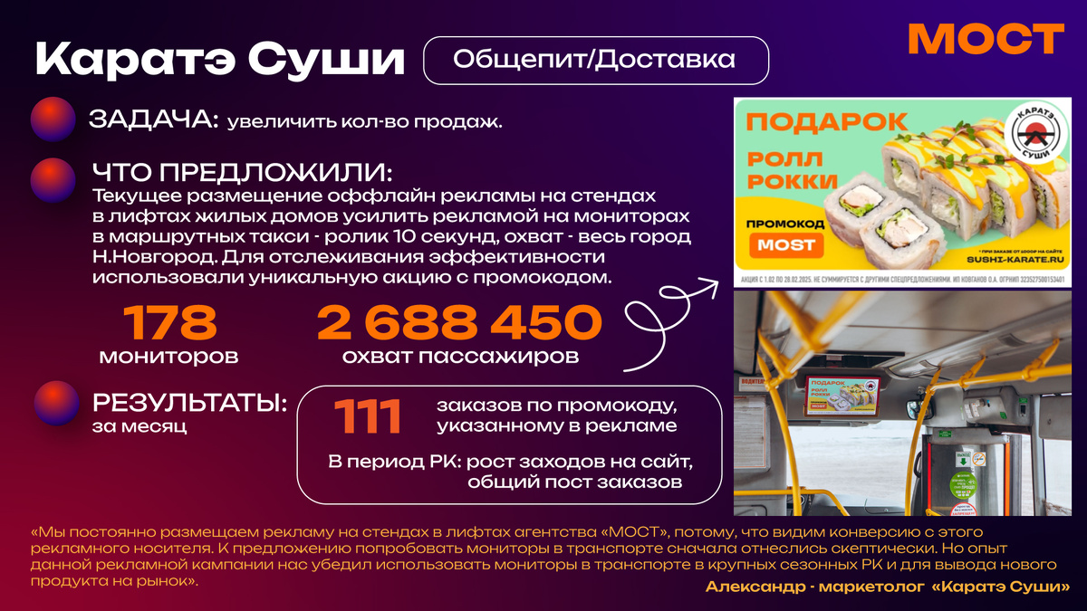 «Опыт данной рекламной кампании нас убедил использовать мониторы в транспорте в крупных сезонных кампаниях и для вывода нового продукта», — Александр, маркетолог «Каратэ Суши».