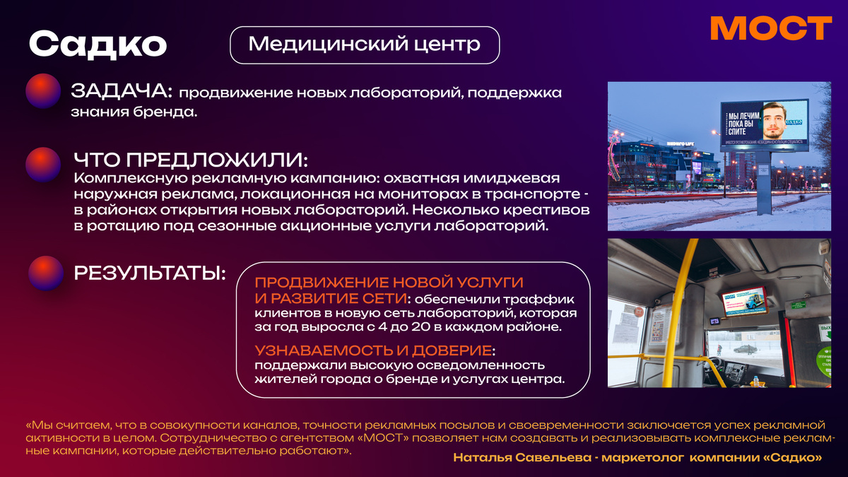 «Сотрудничество с агентством «МОСТ» позволяет нам создавать и реализовывать комплексные рекламные кампании, которые действительно работают», — Наталья Савельева, маркетолог компании «Садко».